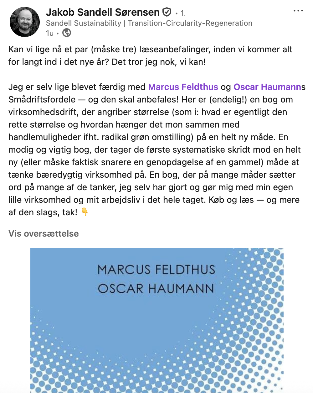 De Smås Uge er organiseret af Marcus Feldthus og Oscar Haumann fra House of Small. I oktober 2025 udgav vi bogen Smådriftsfordele, som samler 6 års forskning i, hvordan virksomheder kan drive en radikal grøn omstilling gennem strategisk begrænsning. Nu samler de stemmerne, der kan få størrelse på den offentlige dagsorden.